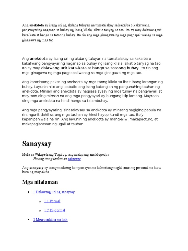 Isang uri ng akdang tuluyan na tumatalakay sa kakaiba o kakatwang pangyayaring naganap sa buhay ng isang kilala sikat o tanyag na tao. Mga Uri ng Anyong TuluyanProsa. Salawikain mga kasabihan o kawikaan.