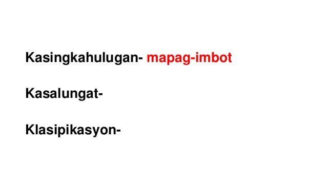 Mga halimbawa ng magkasalungat na salita Kasalungat Malinis-Marumi Halimbawa ng magkasingkahulugan na salita Kasingkahulugan Masikip-Maluwag Pagkatapos niya ayusin ang kanyang maruming kwarto Pamamaraan at estilo ng manunulat sa harry potter Ibigay ang kahulugan ng mga salitang may salungguhit capslock batay sa pagkagamit nito sa sanaysay. Learn vocabulary terms and more with flashcards games and other study tools. Kahulugan ng salita MAPALAD Preview this quiz on Quizizz d hindi orihinal d hindi orihinal d 3.