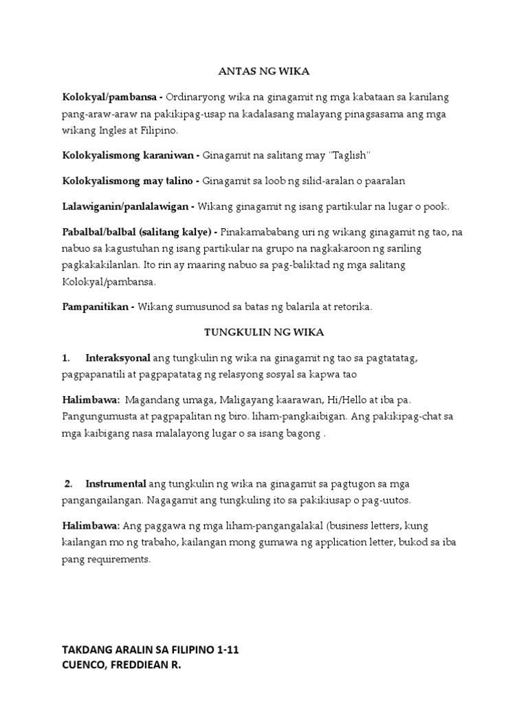 Quezon na ang wikang. Ito ay ang pinaghalong mga wika na ginagamit ng mga Pilipino mga dayuhan o mga Pilipinong may ibang lahi upang magkaunawaan. Sa paaralan tinuturo ang kahalagahan ng mga bagay-bagay katulad nalang ng wikang pambansa.