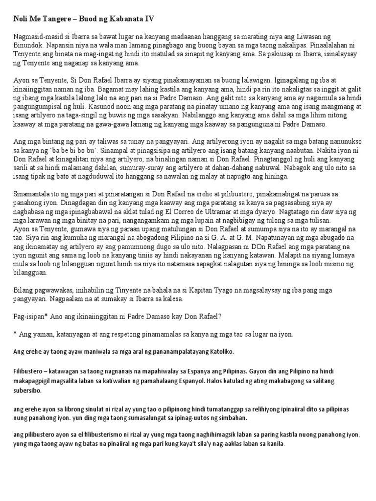 Noli Me Tangere Kabanata IV Buod. Alam ni Ibarra sa kaniyang sarili na wala namang malaking pagbabago sa kaniyang bayan. Ang isang pilibustero ay ang tawag sa mga taong kalaban ng simbahan at.