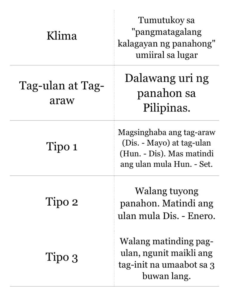 Nakararanas ito ng dalawang panahon sa buong taon- ang tag-init at tag-ulanGayunpaman hindi masasabi na magkakatulad ang klimang nararanasan sa ibat ibang panig ng bansaAng pagkakaiba ng klima ay sanhi ng ibat. Ang klima ay klima ang panahon ay panahon. Ang klima ay nakasalalay sa panahon.