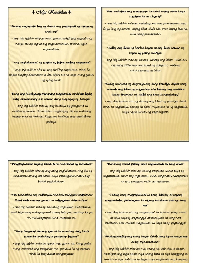 Ang mga kasabihan ay nagbibigay ng payo at nagsasaad ng katotohanan ukol sa mga pang araw-araw natin na mga gawain kilos o disisyon sa buhay. Well-being is in happiness and not in. Ang batang matalino nag-aaral ng husto.