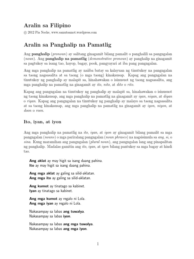 Sa ibabaw ng mesa ko iniwan ang diksiyonaryo. The only common usage of the Tagalog word pamatlig is in the grammatical term panghalip na pamatlig demonstrative pronoun. Ginagamit ko ang kompyuter ni Rica.