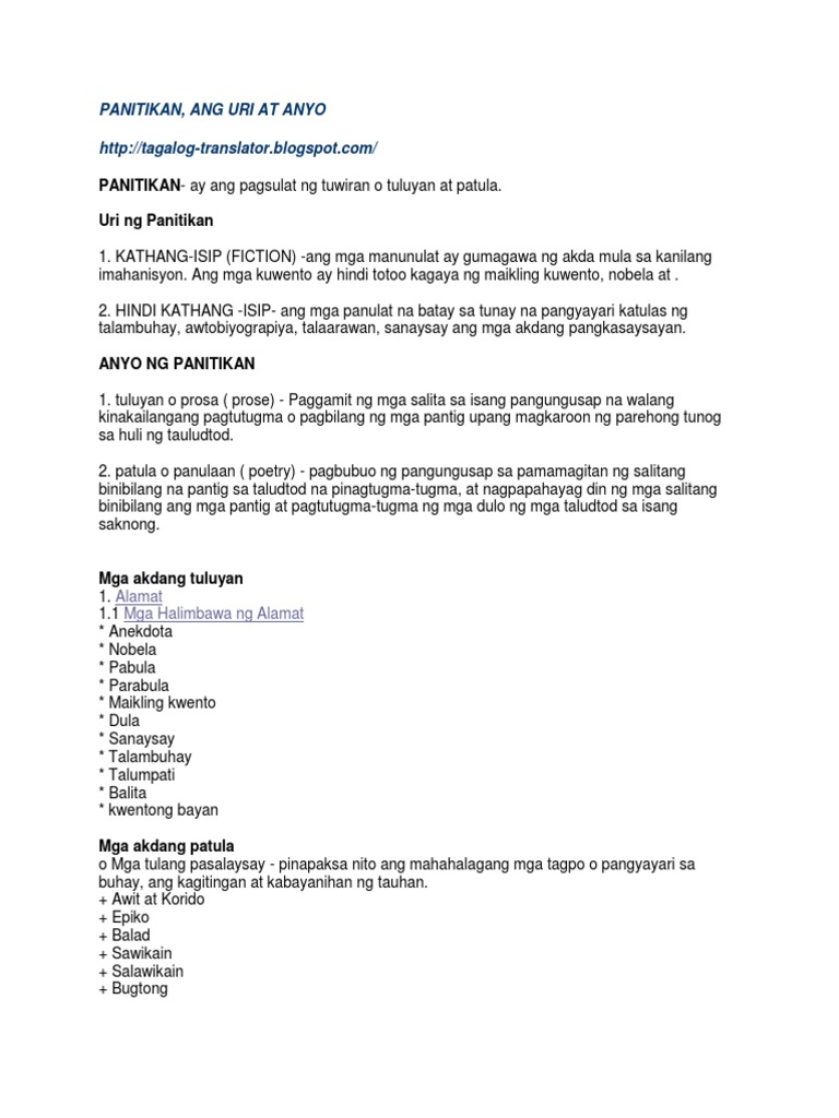Mga Uri ng Anyong TuluyanProsa. Minsan sa mga pinagmulan nga mga hayop or mga halaman. Ang akdang pampanitikan ay tumutukoy sa mga akda o mga sulatin katulad ng mga tula maikling kwento pabula parabula epiko alamat sanaysay.