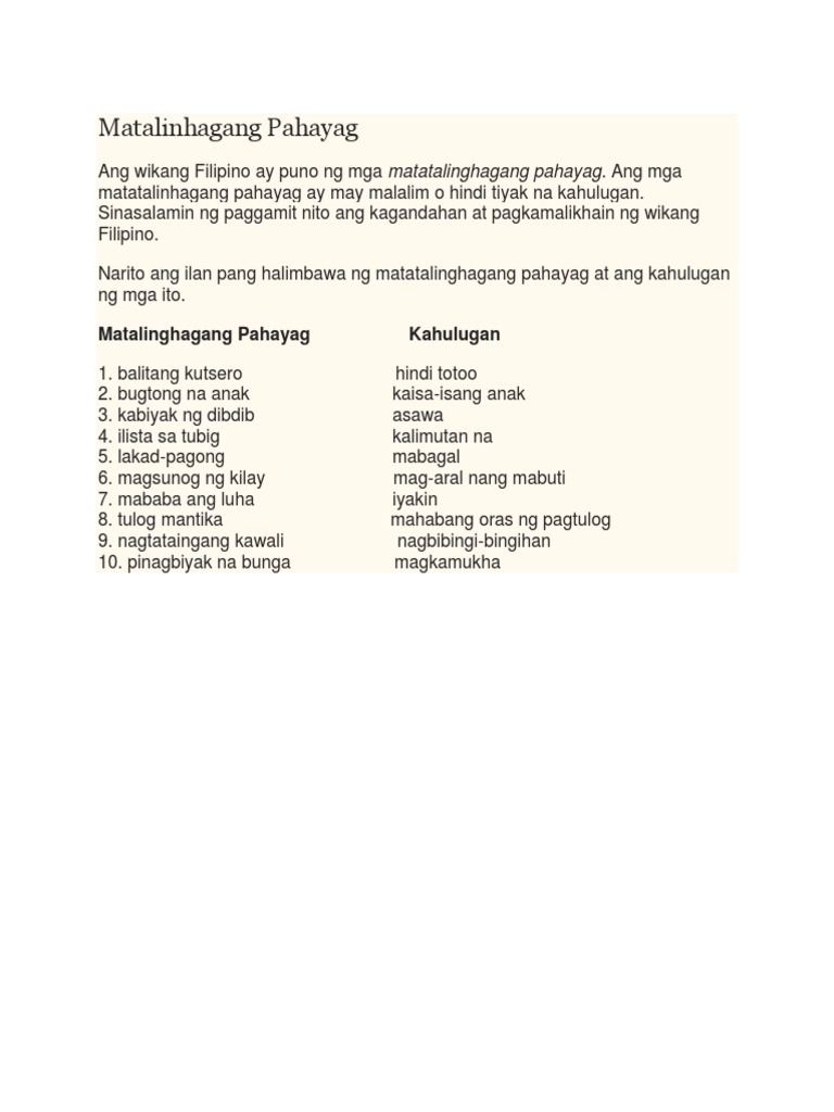 Basa ang papel Kahulugan. Pagsasanay 3 Hanapin sa Hanay B ang kahulugan ng matalinhagang salita sa Hanay A. Matalinhagang salita kasi iyanIm only 10 years old.