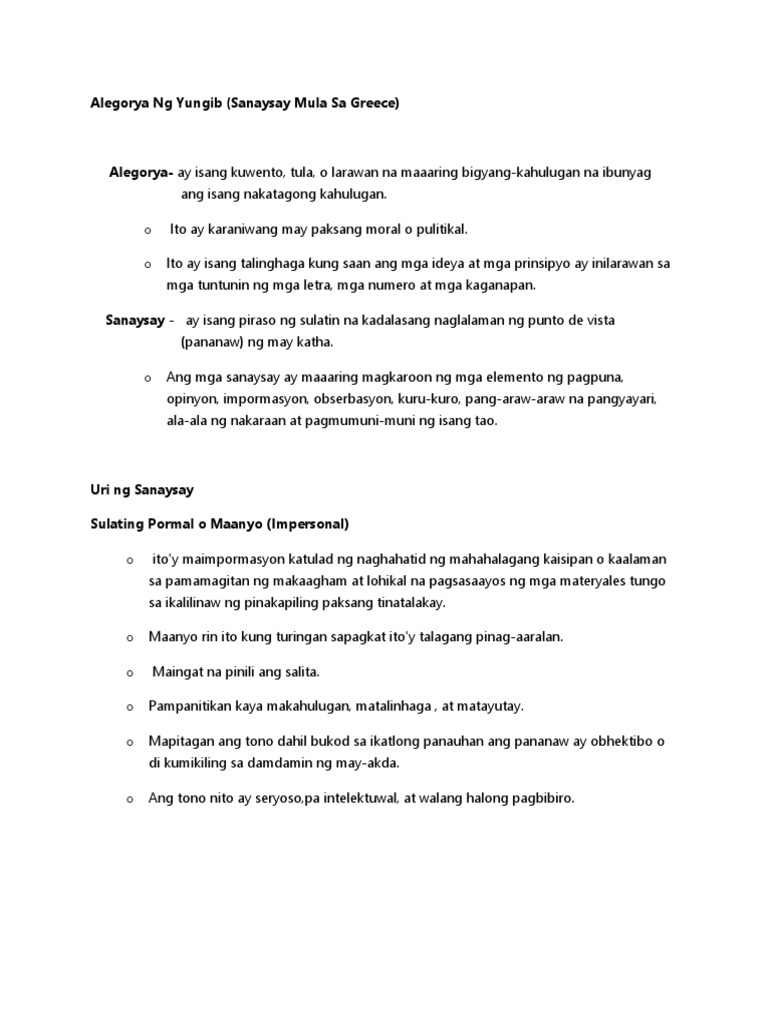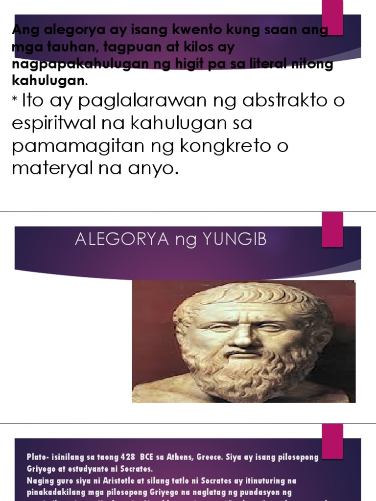 Ito ay maaring magpahayag ng ideyang abstract mabubuting kaugalian at tauhan o pangyayaring makasaysan. Banal na Aklat Tauhan. ALEGORYA ANG ALEGORYA NG YUNGIB Ni PLATO Isinalin sa Filipino ni.